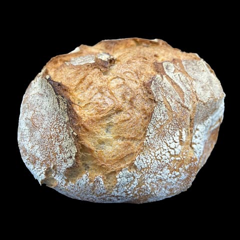 Hogaza de corteza dura y crujiente, con miga blanca alveolada y esponjosa. Elaborado con masa madre de espelta.
